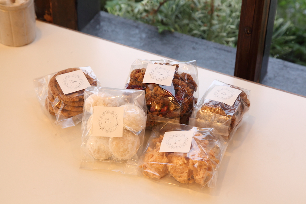 左から時計回りに、口の中にじんわりコーヒーの味わいが広がる、珈琲クッキー380円、グラノーラ580円、オーツ麦とココナッツのクッキー380円、ココナッツのマカロン380円、スノーボールクッキー380円。自分用の3時のおやつにも、ちょっとした手みやげにもできる人気の焼き菓子です。
