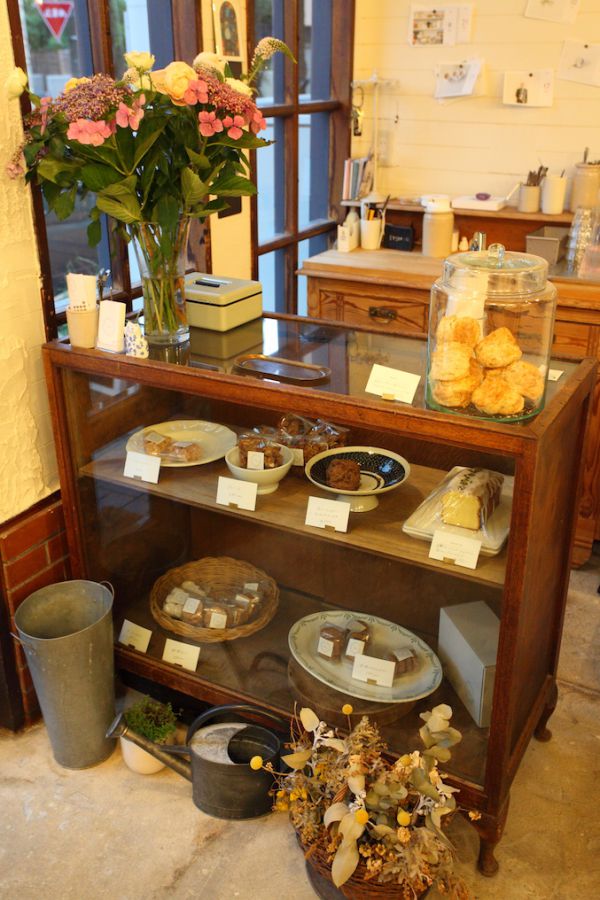 店内のレトロなショーケースには、クッキーやスコーンをメインに、常時8種類ほどの自家製焼き菓子が並んでいるので、おみやげにもおすすめ。季節により、種類が変わるというのも楽しみです。