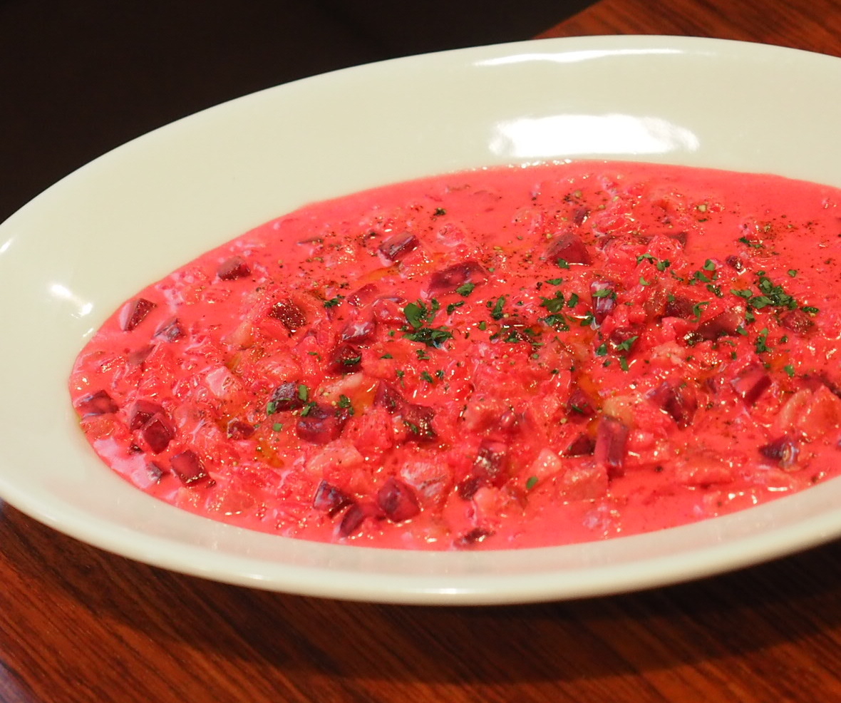 そこへ柔らかくジューシーなビーツの甘み、ふっくら分厚いハムの塩気、そしてほどよい固さのライスが合わさって、スプーンが止まらないおいしさ!使用されているシェーブルチーズはヤギのミルクで作られており、根菜であるビーツのほのかな土らしい風味と相性抜群。
