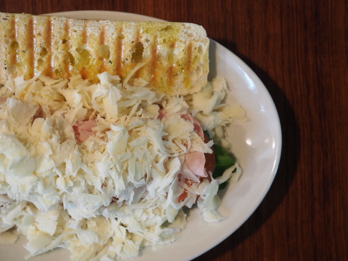 サンドしきれないチーズがお皿にあふれた状態で登場!ほどけるような口当たりのチーズに、香り高いトリュフの香りが楽しめるハム、そしてみずみずしい野菜の組み合わせがたまりません!