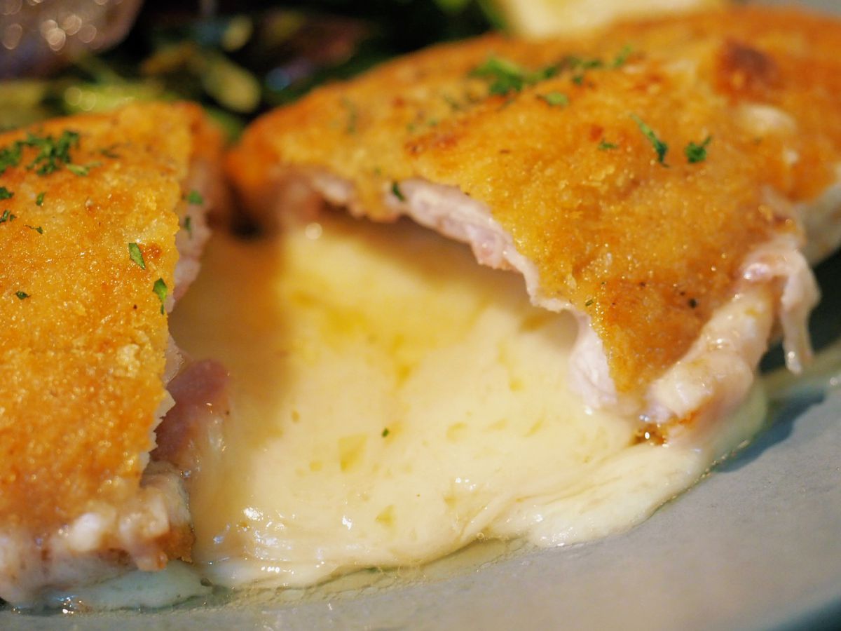 かたまりのラクレットチーズを生ハムでくるみ、それをさらに豚のロースで包んで揚げたこちらの一品。ナイフを入れると…とろとろのチーズが流れ出てきます!