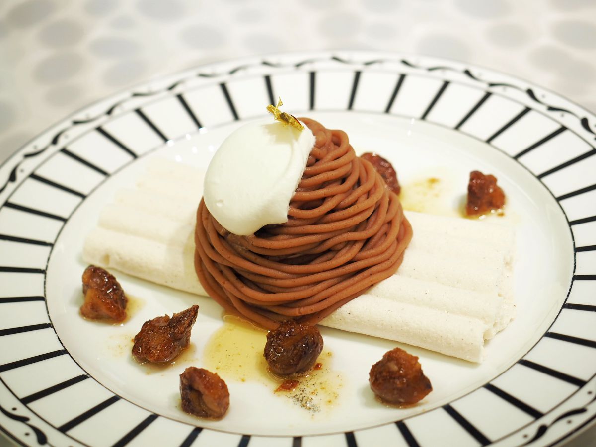 最後にご紹介するのが、こちらの「デセール モンブラン」(2700円)。マロンクリームに生クリーム、メレンゲ、バニラ風味のマスカルポーネ、そしてクレームシャンティなど、口当たりと味わいが異なるさまざまな素材を絶妙なバランスで組み合わせています。甘酸っぱい野バラの実のコンポートや、マロンのポワレが良いアクセント!贅沢なモンブランに、きっと感動するはず。