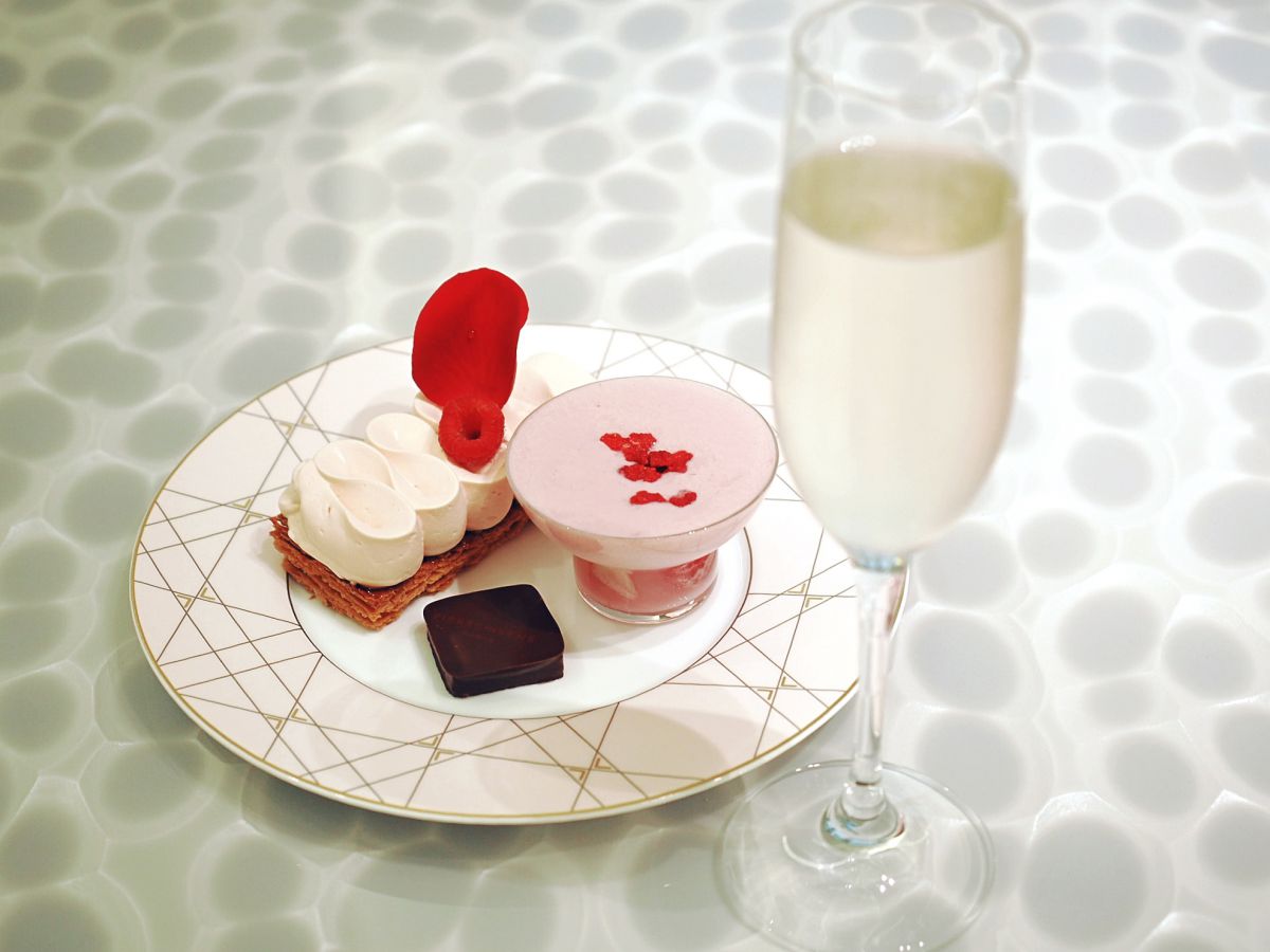 ローズとフランボワーズ、ライチが香るミルフィーユは、サクサクの生地になめらかなクリームがたっぷり乗って絶品!キリッと冷えたシャンパンもいただけば、疲れなんてどこへやら。