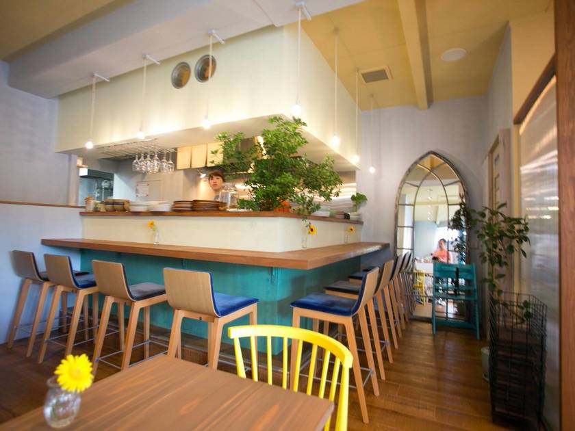 店内も青を基調とした明るい空間。家具の配色など、絵本のなかの世界のようで可愛い!グリーンやお花がたくさん配置されているので、その場にいるだけでも明るく楽しい気分になれる雰囲気です。