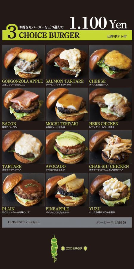 「ZOCバーガー」なら好きなのバーガーを3つも選べて1100円、山芋ポテト付きというのがいいですね。ミニサイズとはいえ、結構お腹いっぱいになりそう。