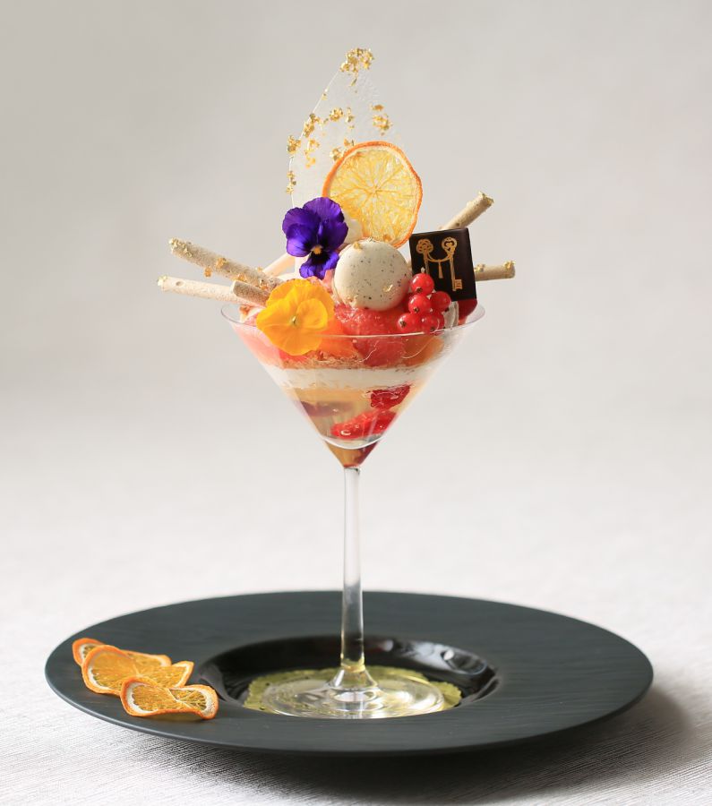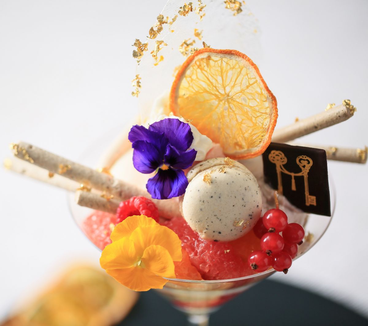 「はるみみかん」と相性が良く、芳醇な香りのアールグレイを、アイスや棒メレンゲ、マカロンに使用。さらにヨーグルトのアイス、ピンクグレープフルーツのソルベ、エルダーフラワーのジュレ、はるみみかんのゼストが入ったオパリーヌ(飴細工)やエディブルフラワーなどで飾り、かわいらしい見た目を演出。色彩豊かで写真映えする“ご褒美”の 名にふさわしい極上新感覚のパフェができ上がり。