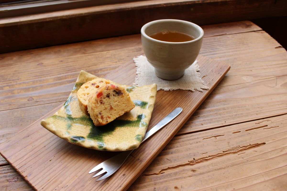 「酒泉館」で味わいたいのが、オリジナルの酒スイーツ。こちらのケーキは古酒に漬け込んだドライフルーツがたっぷりと入った酒フルーツケーキとほうじ茶セット540円。日本酒のうまみがじゅわっ!と染み出す贅沢なひと品です。酒の仕込み水で淹れたほうじ茶との相性もばっちり。