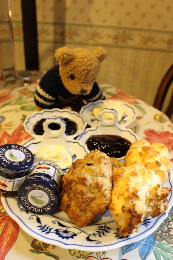 焼き立てのスコーンは、プレーンとブルーベリーの2種類。ざくざくした食感がたまらない軽い仕上がりです。スコーン自体の甘さは控えめなので、ブルーベリージャムと、クロテッドクリームの両方をたっぷりつけて食べてみて。スコーンの熱でクリームが溶けてしまうので、先にジャムをつけるのがおすすめです。