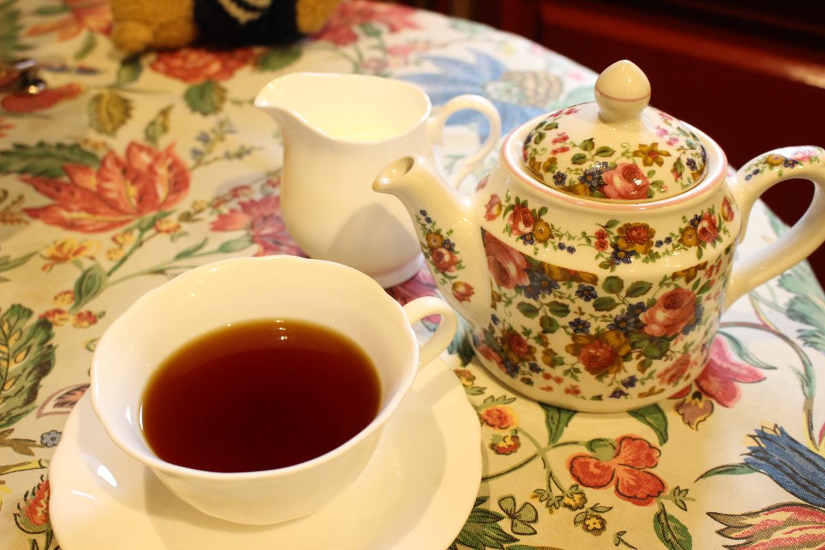 飲み物は、セイロンブレンドのホットティーがたっぷり2杯分ポットに入っています。1杯目はストレートで楽しみ、やや濃いめになった2杯目をミルクティーで飲むのがおすすめ。