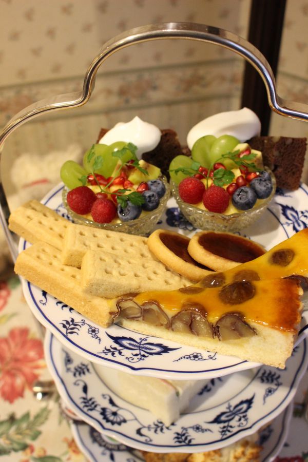 3段のスタンドで提供される「アフタヌーンティセット」。フルーツ、パウンドケーキ、タルト、ショートブレット、プチサンドイッチ、スコーンなどがプレートにのり、しっかりと食べ応えのある量です。