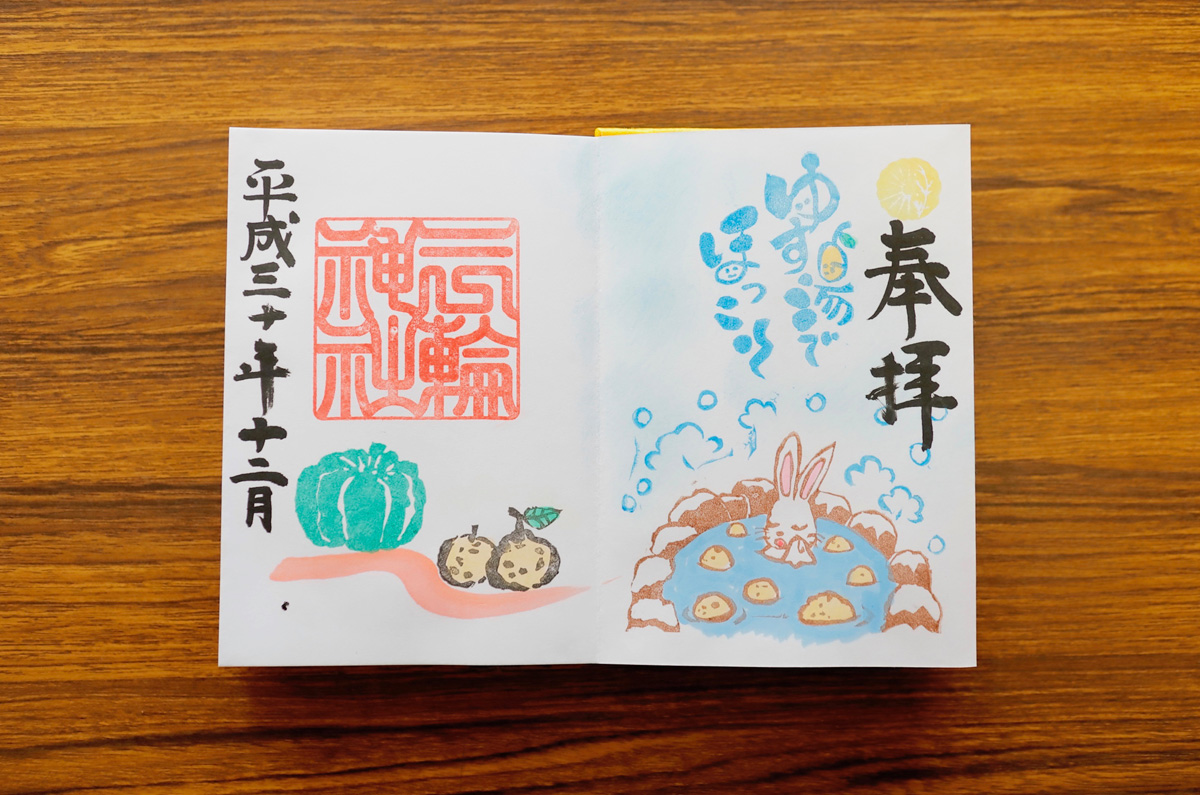 写真は月替わりの御朱印(2018年12月バージョン)。冬至にちなんで、ゆず湯に浸かるうさぎが消しゴムはんこで捺印されています。御朱印は片面300円。月替わりの御朱印のみ見開き600円のデザインもありますよ。