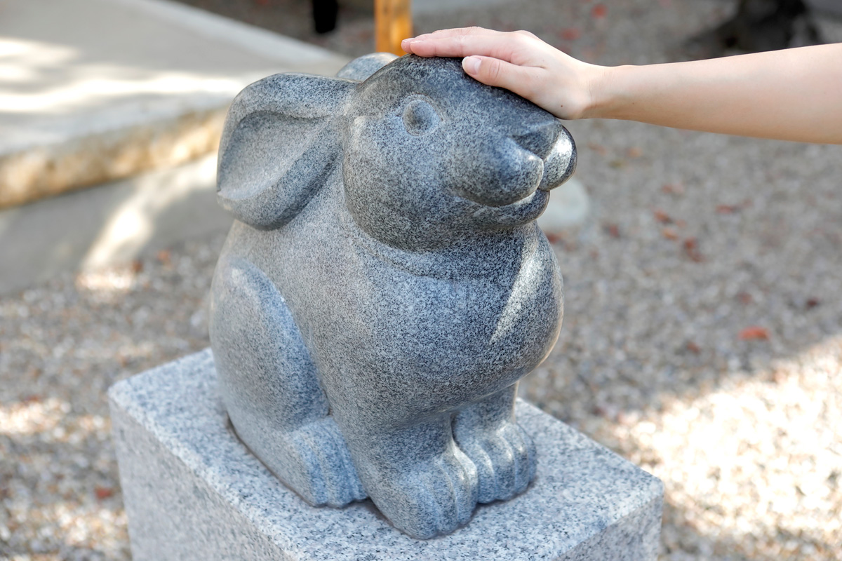 大物主神の化身はうさぎだそうです。ピョンピョンと跳ねることから、うさぎは昔から縁起のいい動物だと言い伝えられてきました。本堂の前にあるうさぎの石造は「幸せのうさぎ」と呼ばれ、なでると幸福が訪れるのだそうです。