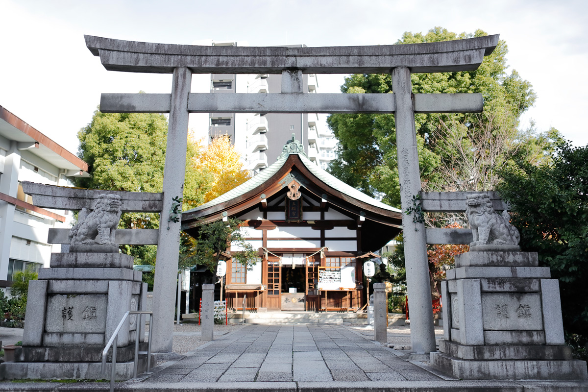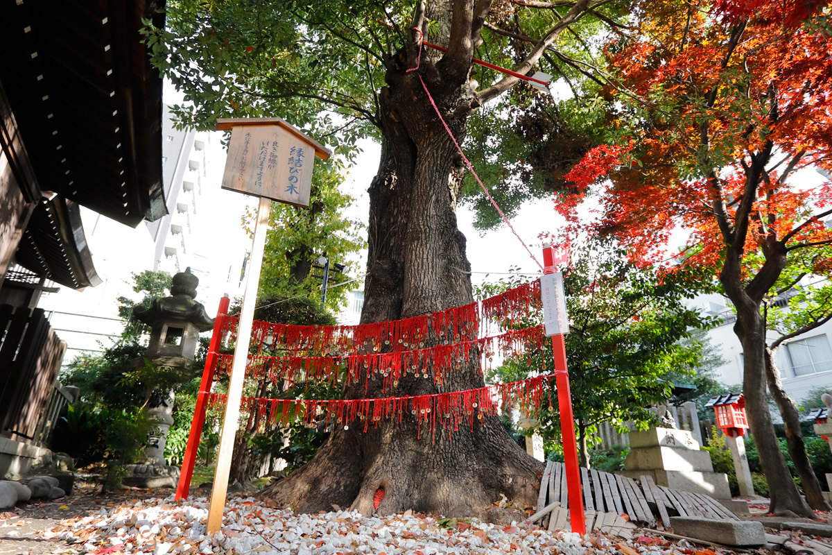 本堂と矢場跡の間に立つ樹齢450年クスノキはご神木です。御祭神の大物主神は縁結びの神様としても知られているので、木に手を当てて祈りを捧げれば良縁が期待できるとか。社務所で授与している赤い糸(100円)を結ぶと、より深いご縁が頂けるといいます。