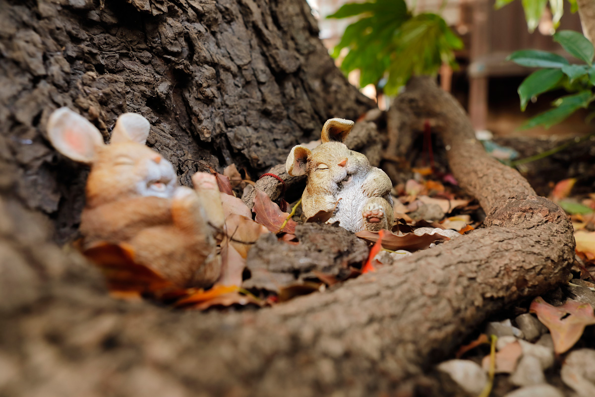 うさぎは石造だけじゃありません。大小さまざまなうさぎの置物が、灯篭の中やご神木の根元など、境内のいたるところに隠れています。しかも、場所は不定期で変わります。どこにいるか、境内のあちこちを探してみてくださいね。