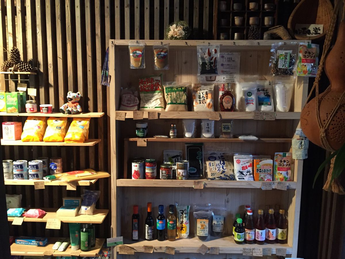 写真は、「自然食+雑貨 kanuka」のコーナー。料理に使用している醤油、味噌、みりん、お酢、塩、砂糖などの調味料は、店の一角で販売もしています。