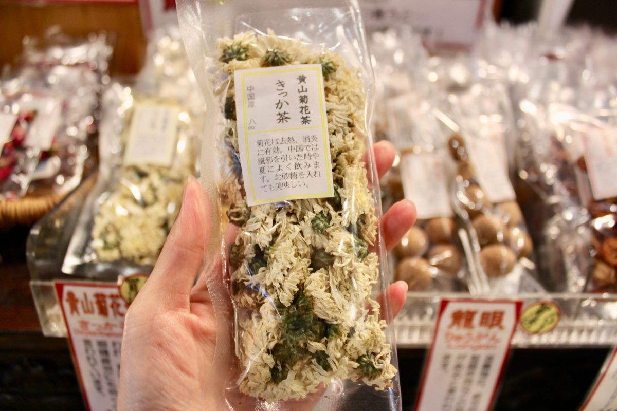 2階で頂いた八宝茶に入っていた菊花茶も売っていました。ほかにもクコの実や龍眼、白きくらげなど、普段はなかなか手に入らない中国茶の食材が買えるんです。茶葉と一緒にそれぞれの食材を買って、自分好みにお茶をブレンドしてみるのも楽しそうですね!