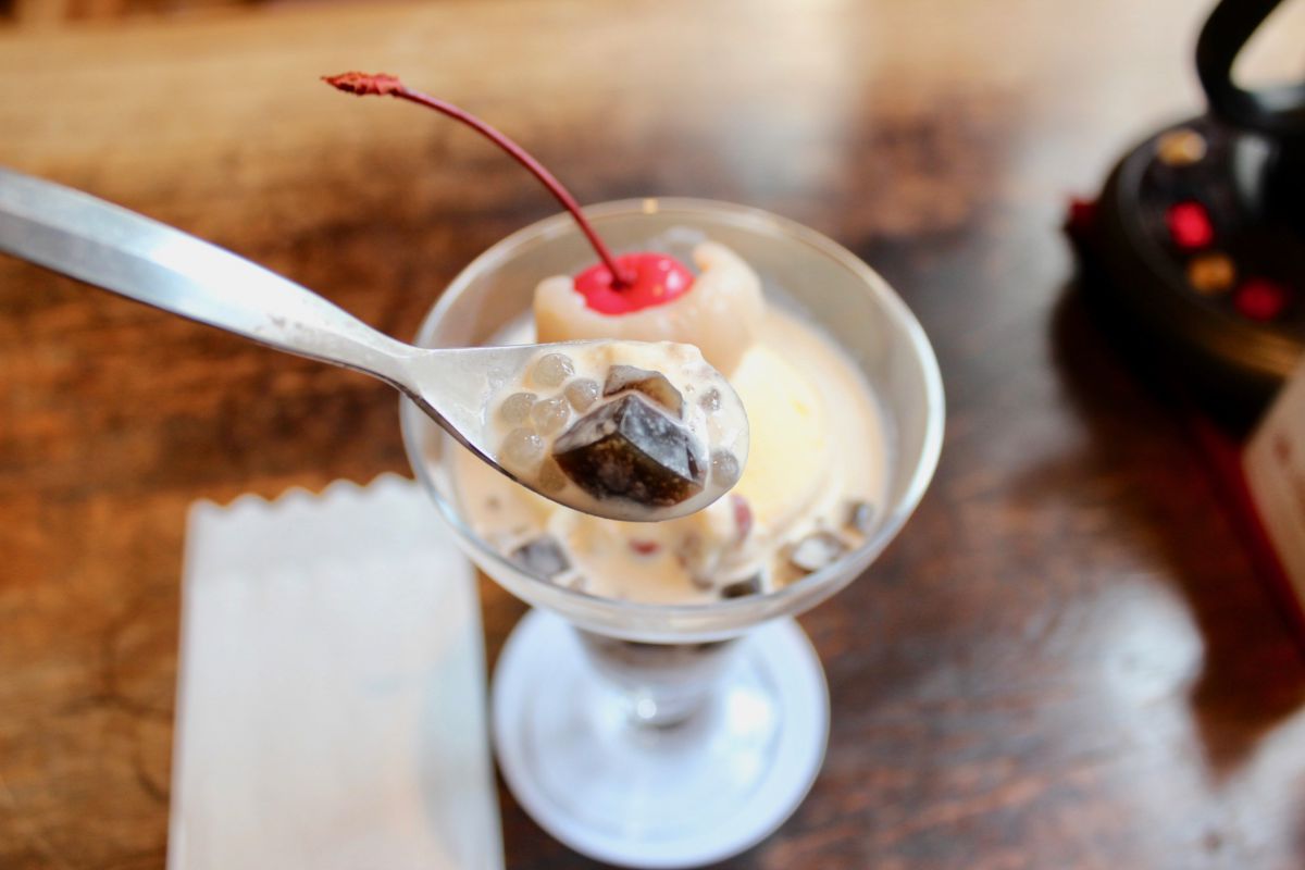中には小さめの白タピオカ、仙草ゼリー、あずきが入っていて、一番上のさくらんぼを包んでいるのはライチなんです!見た目よりも甘さはだいぶ控えめでさっぱりしていて、量もそんなに多くないので、甘いものが苦手な方や男性でも注文する方が多いのだそう。
