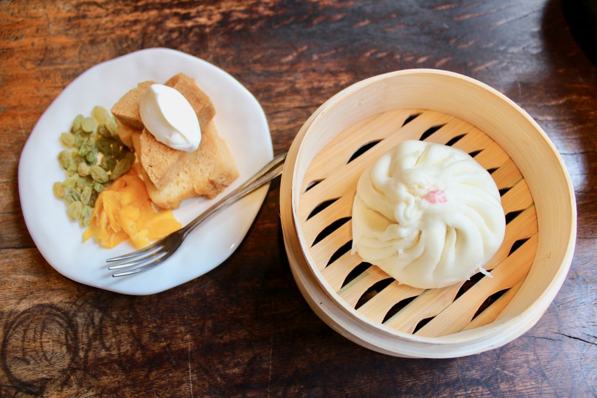 小腹が空いた時には「悟空セット」(500円)。アツアツの中華まんに、マーライコーという中国のカステラ、グリーンレーズン、ドライマンゴーを盛り合わせたよくばりセットです。中華まんは「阿媽(あまー)肉まん」「きのこまん」「なつめあんまん」の3種類からチョイス。