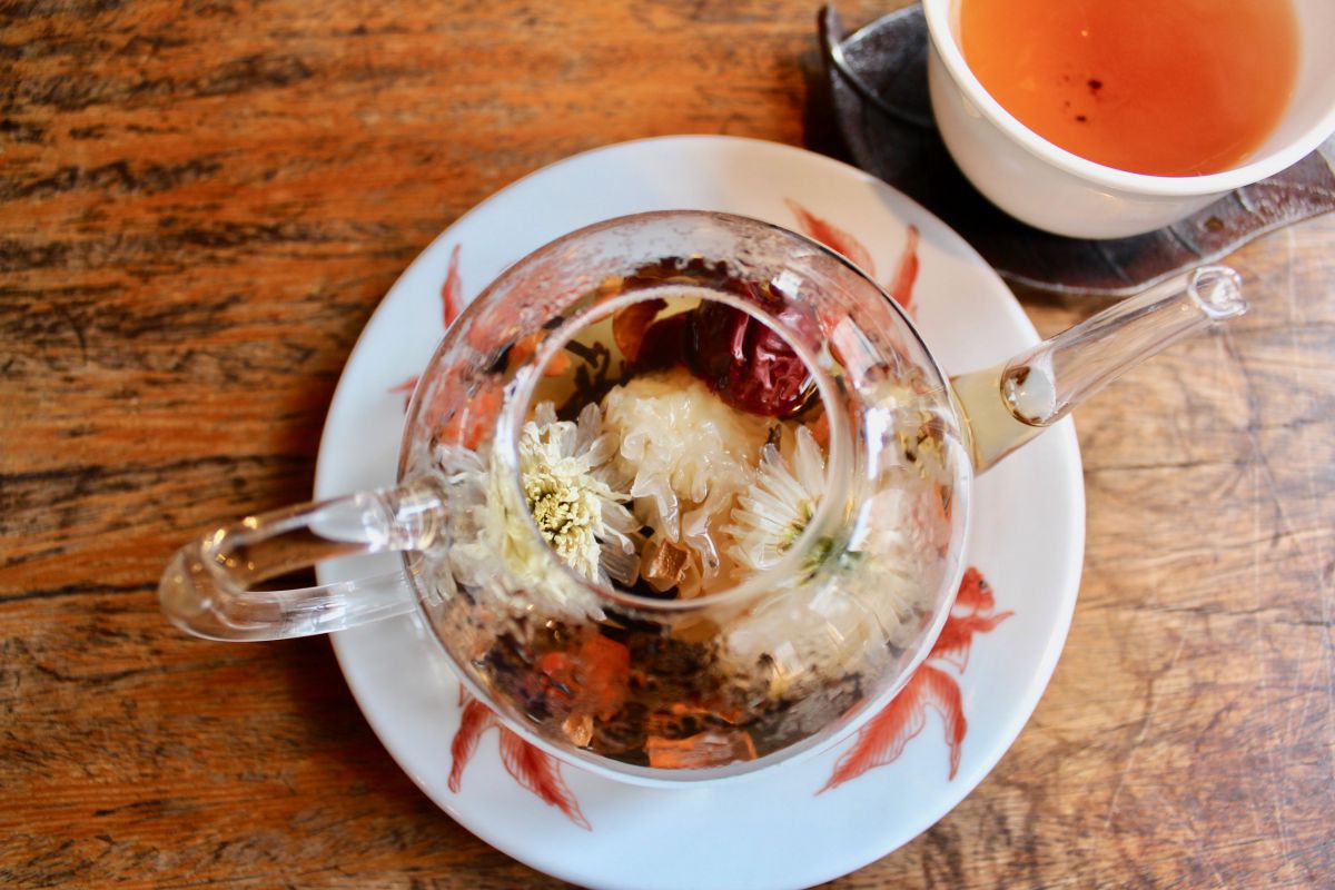 見た目も華やかな八宝茶は、カフェインが強くないので妊婦さんなどにもおすすめなんだそう。香りも良く、ほんのり甘い味にとっても癒されました。
