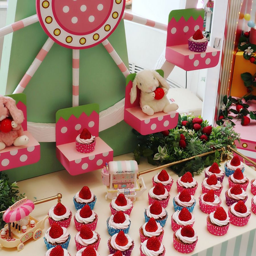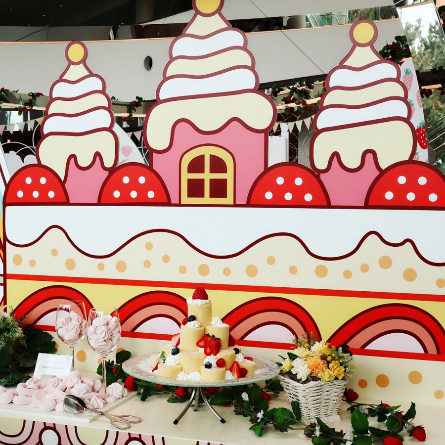 思わず写真や動画を撮りたくなるような、いちごに埋め尽くされたフォトジェニックなレトロ遊園地のデザートビュッフェ。