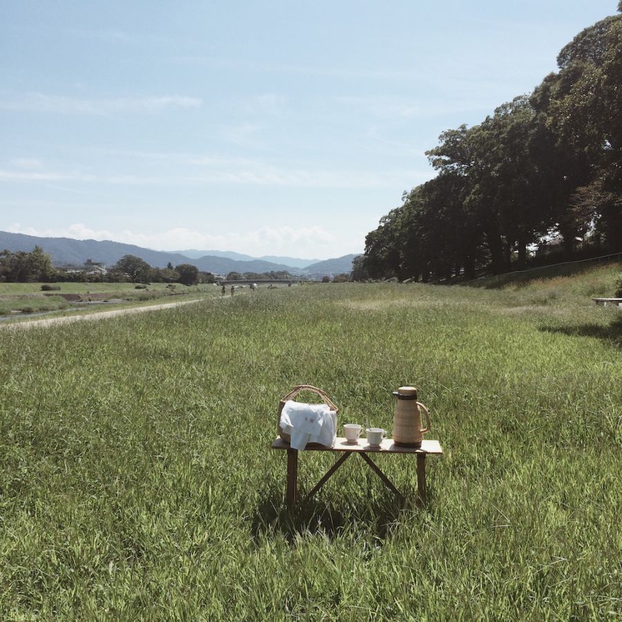 コーヒーの入った水筒、カップ、テーブルクロス、ちょっとしたお菓子が一式になったバスケットを持って、そのまま歩いて100歩ほどで行ける鴨川でピクニックができるというもの。
