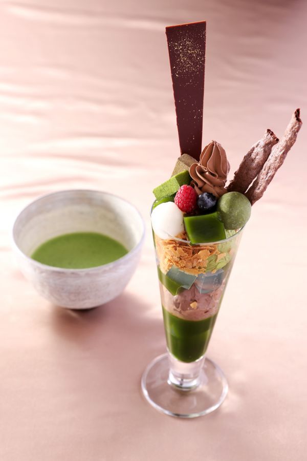 2019年初の新作抹茶パフェがこちら。手土産で人気の「宇治抹茶生チョコレート」「宇治ほうじ茶生チョコレート」「抹茶苺トリュフ お茶苺さん」をすべてトッピング、ダークチョコレートとココアメレンゲをあしらった見た目も華やかなパフェ。