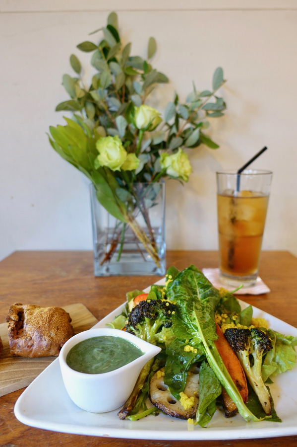このサラダ、ドレッシングを含め、なんと約350g分の野菜が摂取できるそう。旬の野菜3種に5種のグリル野菜をたっぷり盛り付けたひと皿は、スピルリナを使ったドレッシングでいただきます。ツルムラサキやれんこんなど異なる食感や風味が混ざり合い、お野菜だけとは思えないほどのボリュームと満足感。野菜は、横浜市旭区の「えんちゃん農園」の野菜を使っているそうです。無化学肥料・無農薬栽培で作られる野菜は味が濃く、歯ごたえもバツグン。こんがり焼かれたパンも風味よく、サラダに負けない主役級の味わいです。