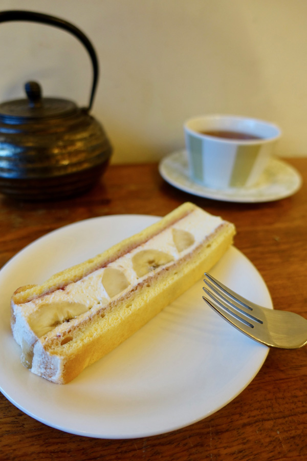 食後にはスイーツと温かい紅茶をぜひ♪「くだもののショートケーキ」(820円)は、季節によって旬のフルーツがごろりと入る贅沢な商品。この日はバナナと洋梨入りで、さっぱり甘さ控えめのクリームにしっとりスポンジ生地がほどよく、食後でもスルリといただけてしまう軽やかな味わいです。華やかな紅茶との相性もピッタリ!