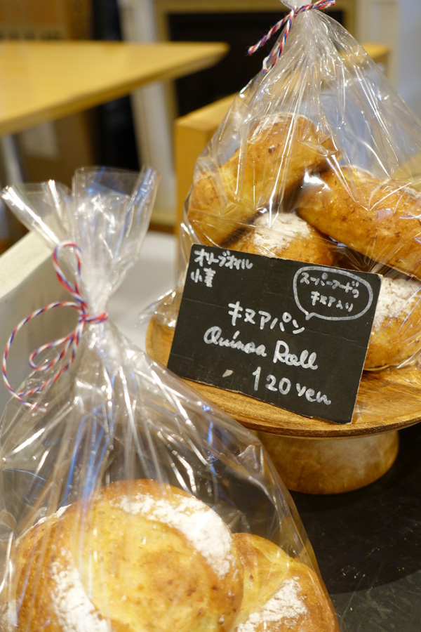 店内では、「キヌアパン」(120円)や焼き菓子も販売しています。キヌアパンは生地にマッシュポテトとオリーブオイルを配合し、もっちり&しっとりの食感を実現。動物性食材を使っていないので、ビーガンの人にもオススメ。