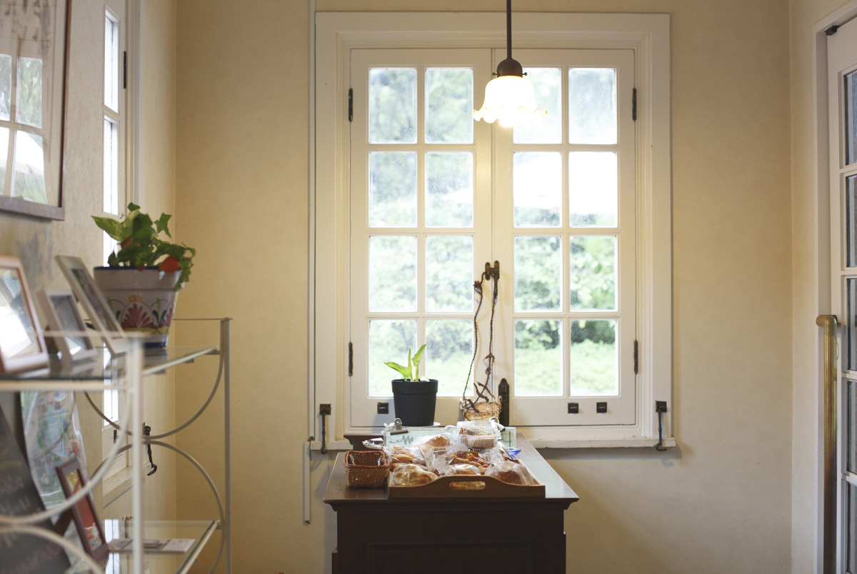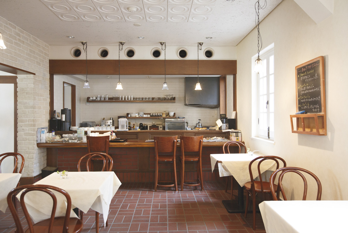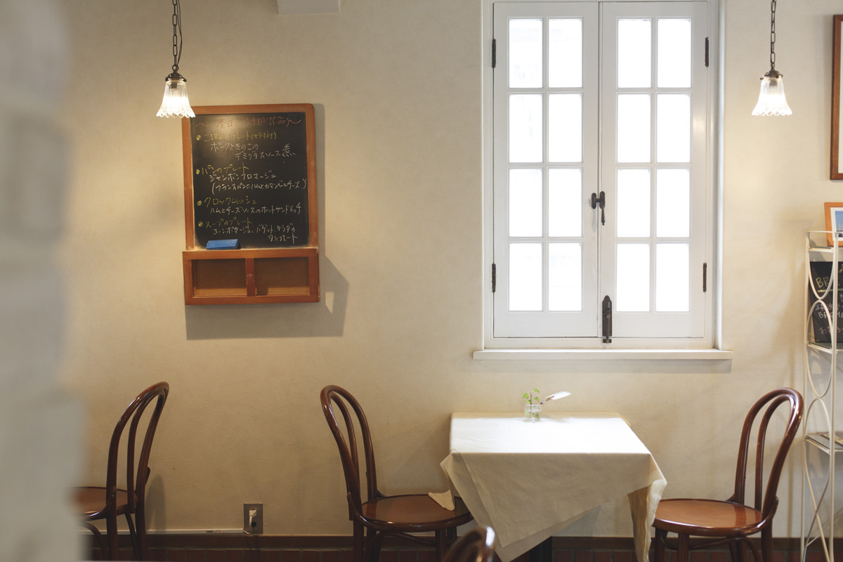 扉を開けると、レトロな外観とはまた少し違ったビストロのような華やかな雰囲気。フランスのパン店で働いた経験を持つ、店主・長嶌桃さんがフランスに住んでいたころに通った「近所のカフェ」をイメージし、家具を集めたそうです。落ち着いた色味に曲線を配したインテリアが、穏やかな空間を生み出しています。