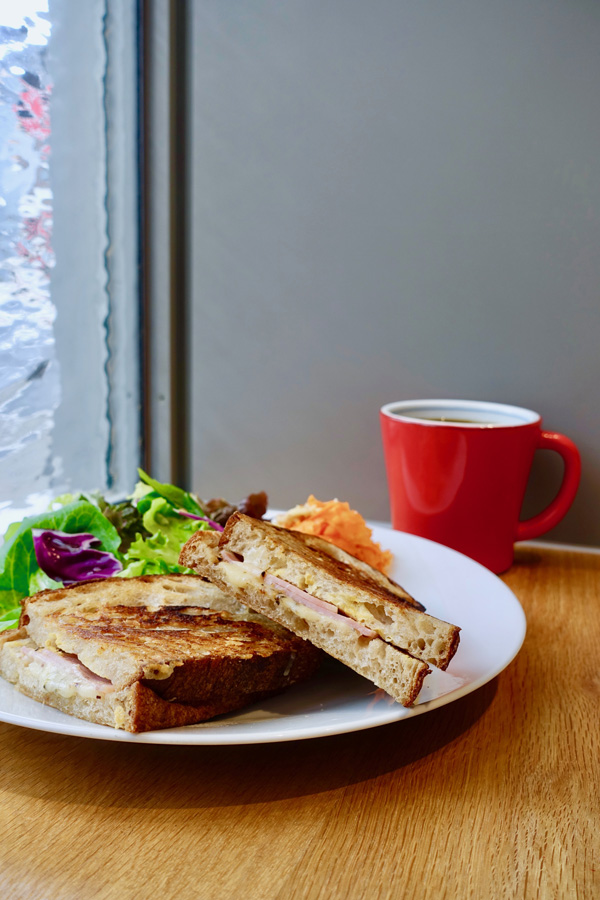 4種あるメニューのなかでも人気の「グリュイエールチーズ&スモークハム」(750円)を、今回はオーダーしました。思いっきり頬張ると、ひと口目は想像以上に歯ごたえを感じます。バターを塗って焼き上げたサクッとした食感のパンをそのまま噛むと、チーズのやわらかい酸味とハムの塩気、そこにしっかりとした小麦の風味と香ばしさが鼻を抜けます。食材はパンの美味しさを引き立てるための名脇役で、圧倒的な存在感はパン。そのままでも食べたくなる、絶妙な食感と風味が余韻を残します。