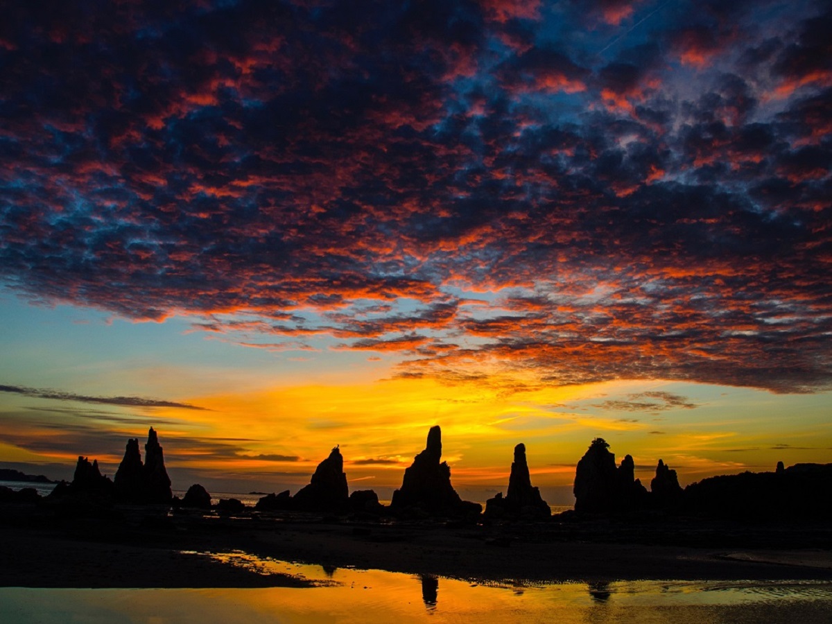 同じく、ハロン湾を連想させるような絶景を見ることができるのが、南紀白浜空港から車で約1時間のところにある串本町の「橋杭岩(はしぐいいわ)」。海中に約850mもの列を成して大小40余りの岩柱がそそり立っていて、規則的な並び方が橋の杭に似ていることからこの名前に。朝焼けの時には、美しい海に岩々の神秘的なシルエットが浮かび上がり、まさにハロン湾の朝焼けのよう。こんな雄大な景色を眺めたら、すぐにパワーがチャージできそうですね。