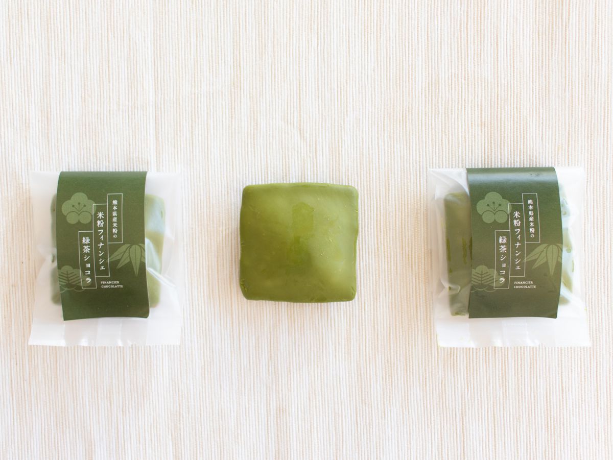 「米粉フィナンシェ 緑茶ショコラ」は、熊本県産の米粉と小麦粉、宮城県高千穂のバター、地元産の蜂蜜などを使ったフィナンシェを、熊本御船町産の緑茶粉をブレンドしたチョコレートでコーティング。とことん九州にこだわったスイーツです。
