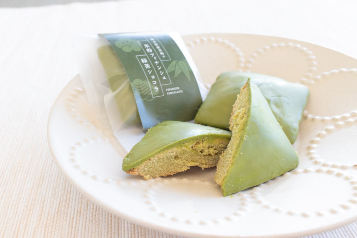 フィナンシェは米粉ならではのモチモチ感のなかに、しっとりとした食感。甘すぎず、すっきりとした味わいの緑茶ショコラともベストマッチ!