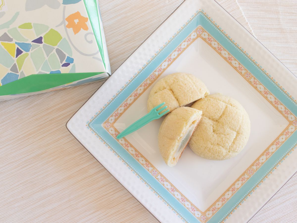 「茨城めろんの片想い」は、完熟メロンの果汁を白餡に練り込み、パン生地で包み込んだ、メロンパンとおまんじゅうのコラボスイーツ。メロン生産量日本一の茨城県ならではの逸品は、京都在住のデザイナーが手がけた和モダンなパッケージも素敵!