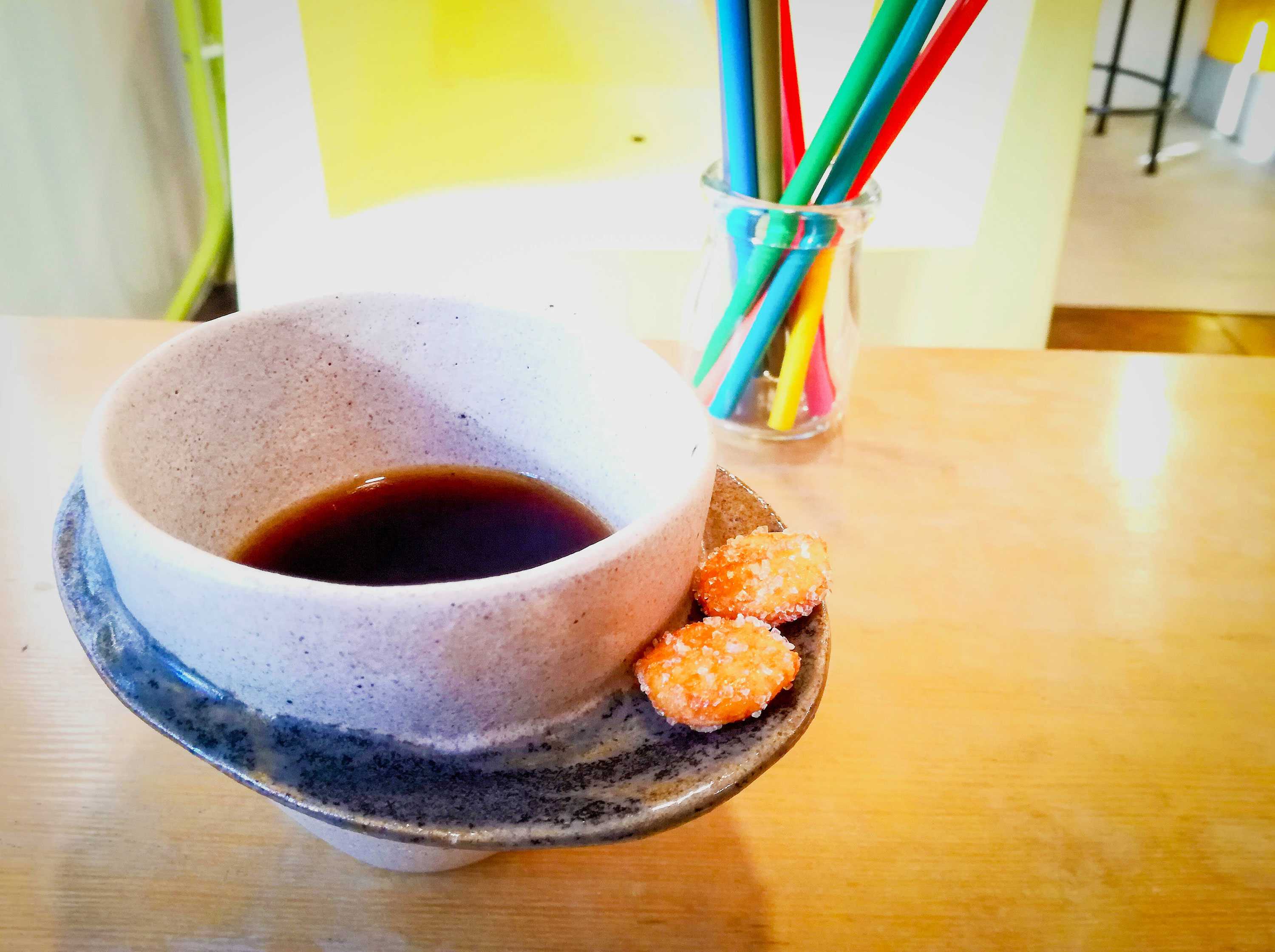 土星をイメージした器と、そこにちょこんと載せられた一口サイズのおせんべいがとってもキュートです。カフェを開いた理由について神谷さんにたずねると「日本の文化とも言えるおもちゃの世界を、もっと開かれたものにしたかったんです」との答えが。