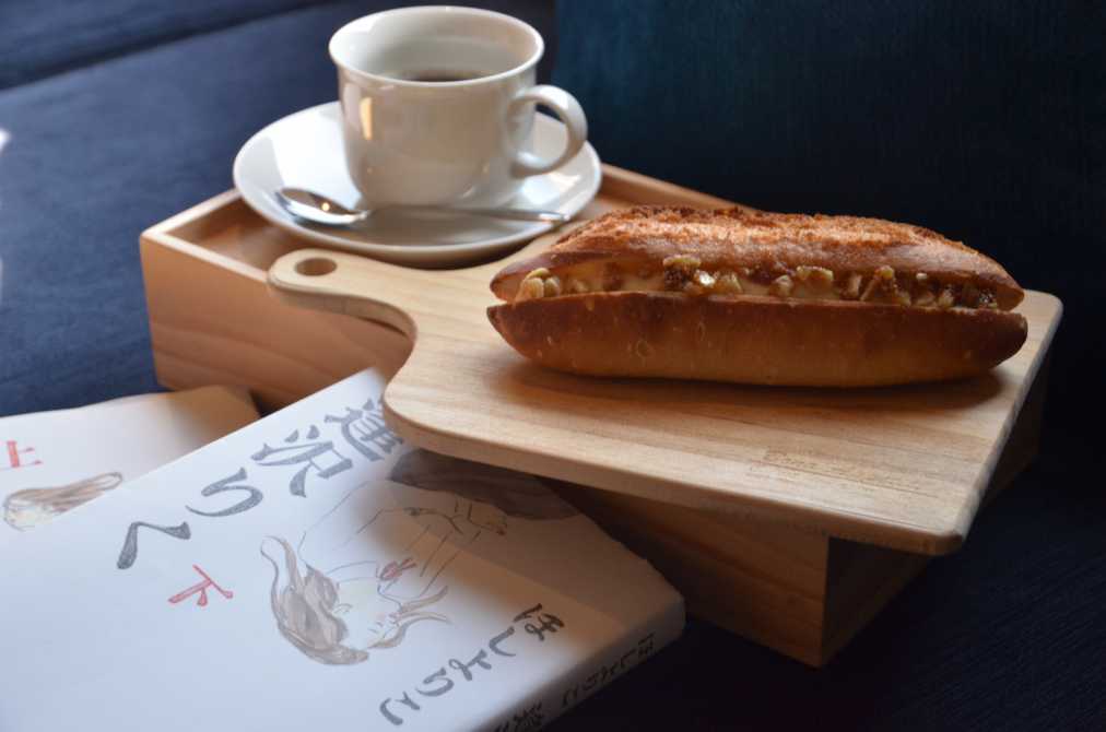 ソファーで本を読みながら軽食を楽しめるように、センスのよいドリンクボードとカッティングボードが用意されています!この日、コーヒーのお供に選んだのは、同じビルの1階にある パン屋さんのいちじくパン。 飲み物も食べ物も持ち込みokなんて、太っ腹です。