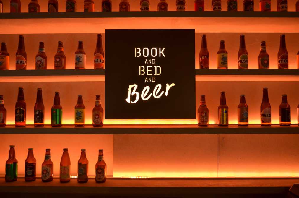 受付の壁にずらりと並ぶ世界のビール。Book、Bedに続く3つ目のBはBeer!ワールドワイドなビールの酔いが、気持ち良い寝落ちを誘います。