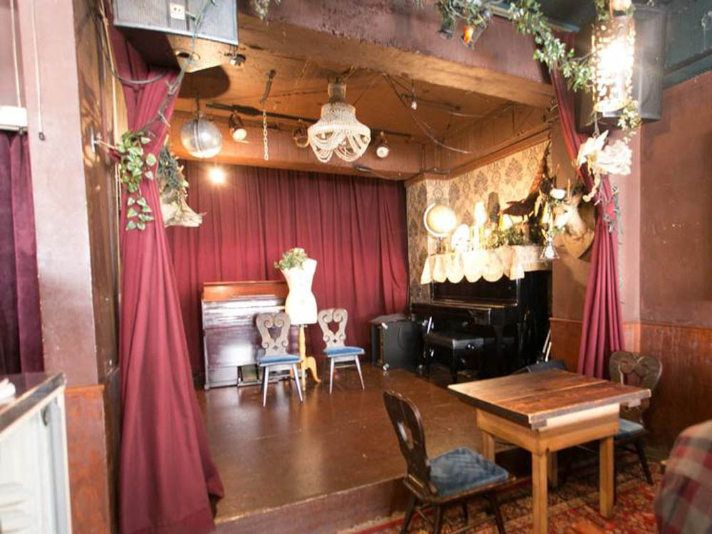 「音楽喫茶ヲルガン座」の特徴のひとつは「大きなステージ」があること。ここではライブやお芝居などが行われています。音楽や舞台を間近で楽しみながら、スイーツやドリンクを楽しめる空間になっているんです。