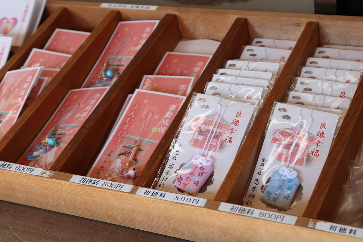 授与所では、さまざまな恋のお守りを分けてもらえます。人気は陶器でできた「ハート守り」。いつも持ち歩く小物につけてもかわいいし、ますますの御利益が期待できそう。