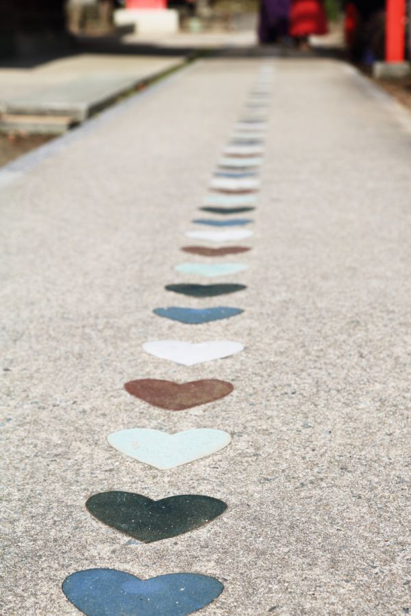 恋木神社の拝殿までは、ハート型の陶板が埋められた参道を辿って行きましょう。陶板は水田天満宮窯元・水田焼のもので、境内のあちこちに散りばめられています。ハート型は、恋木神社の御神紋でもあるのだそう。