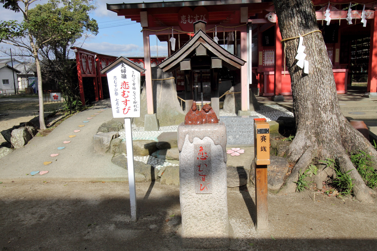 拝殿脇の石像「夫婦雛 恋むすび」にも注目。禰宜(ねぎ)の宮原さんによると、「恋人同士でなでれば、恋がずっと続くと言われていますよ」とのこと。女子だけでなく、彼と一緒にデートで訪れるのもいいですね。