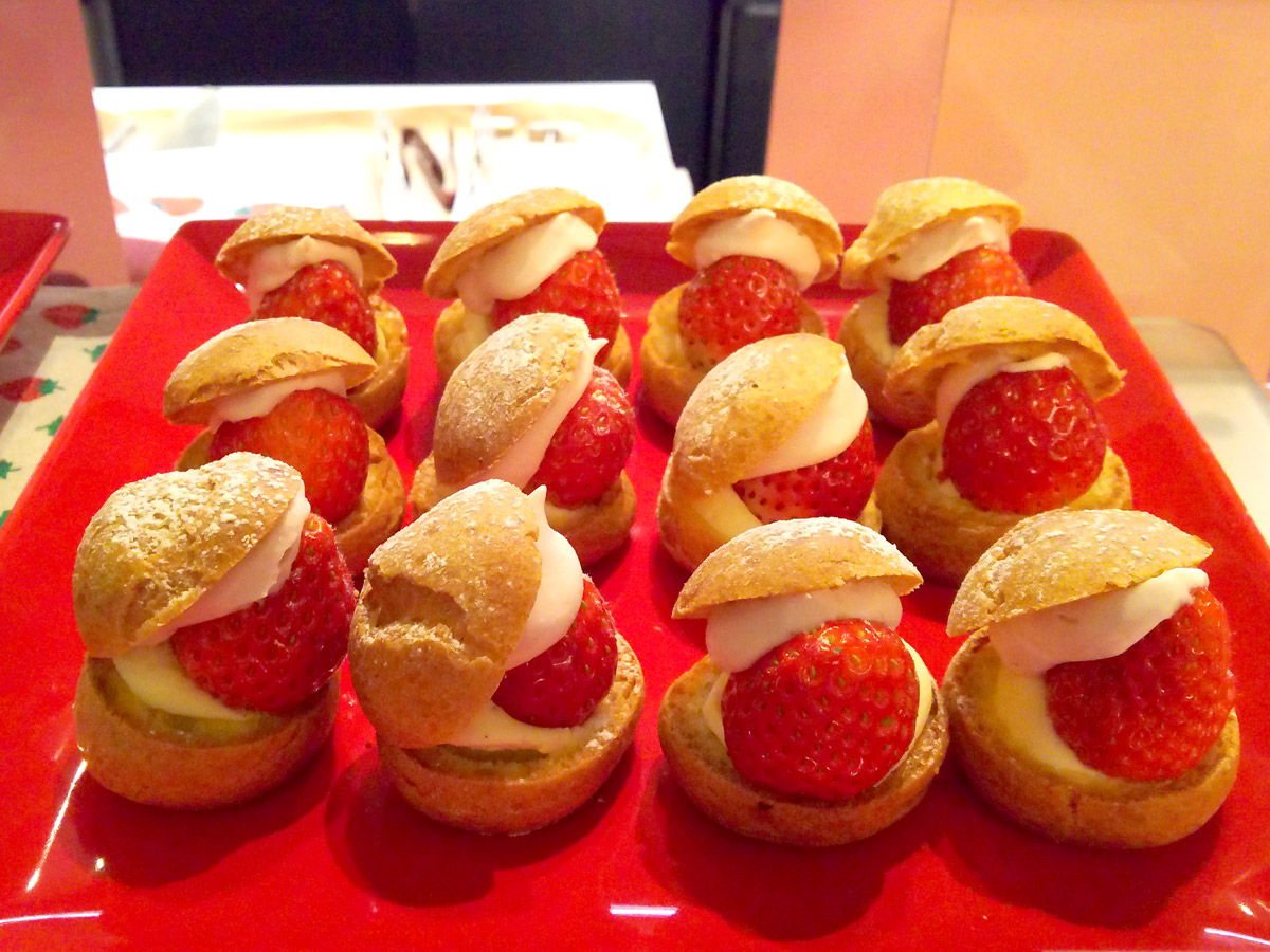 いちごを丸ごと1個使用した「ストロベリーパフ」。甘さひかえめ&小ぶりサイズなので、食べやすさも◎。
