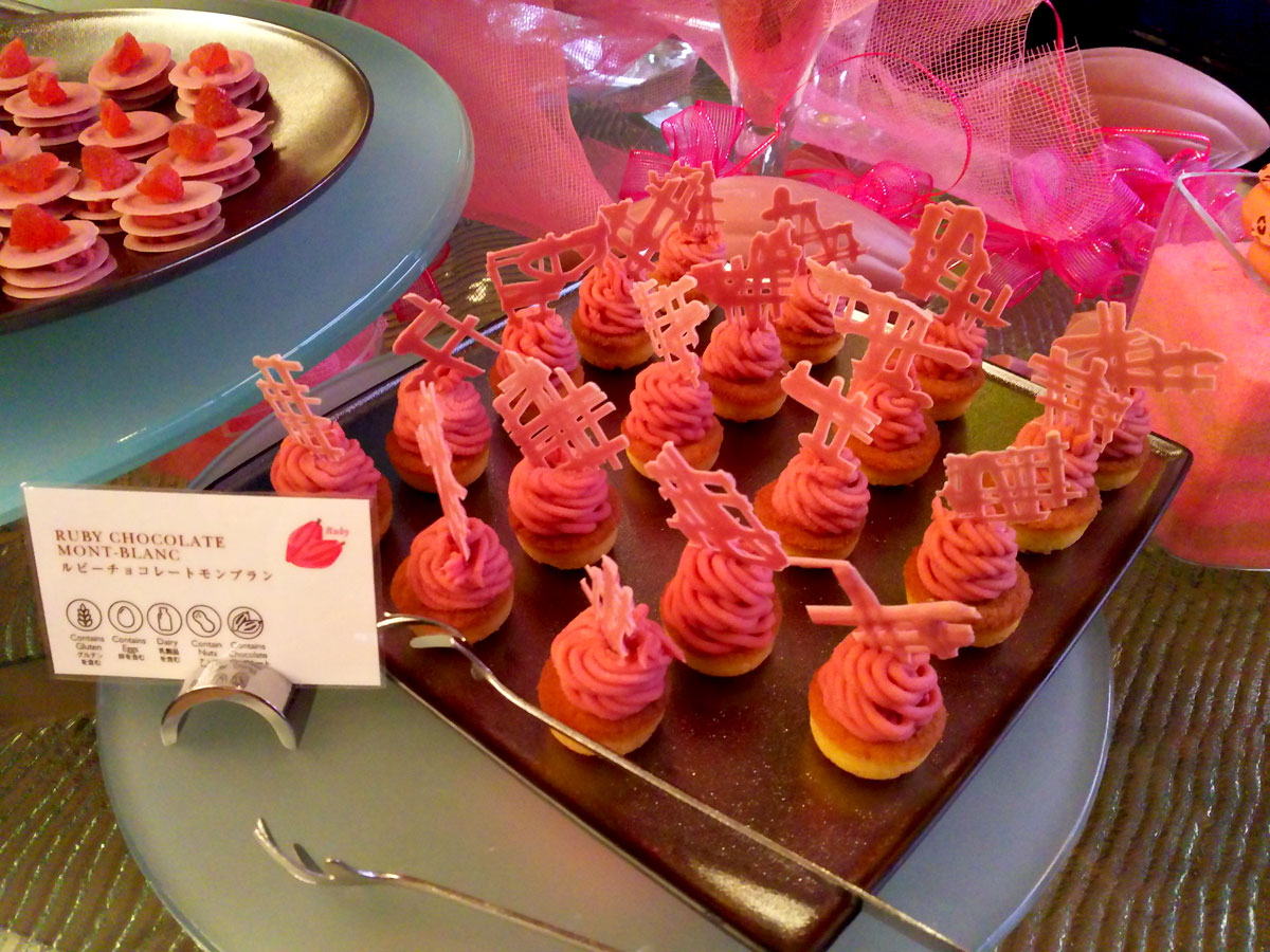 ストロベリースイーツを一通り楽しんだら、店内奥のルビーチョコレートスイーツのコーナーへ。昨年から1月14日まで開催されていた「チョコレート・デザートブッフェ」から、全種類リニューアルしています。前回食べられなかった人も、話題のルビーチョコレートを味わうチャンス!