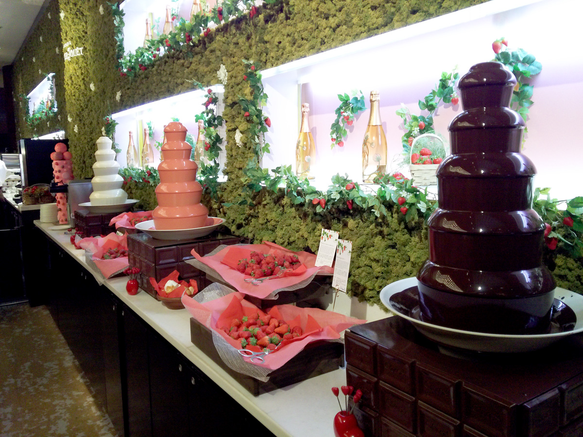 店内左手奥は、いちごの食べ比べコーナー。「あまおう」「とちおとめ」「紅ほっぺ」「さがほのか」「さちのか」「きらぴ香」「ゆめのか」の人気の品種から、常時5種類がスタンバイ。注目は、福岡発のブランドいちご「あまおう」。食べごたえのある大きさで、果汁が多くジューシー。そのままで味わうのはもちろん、ホワイト・ダーク・ルビーチョコレートと3種類用意された、チョコレートファウンテンで味わってみるのもおすすめ!