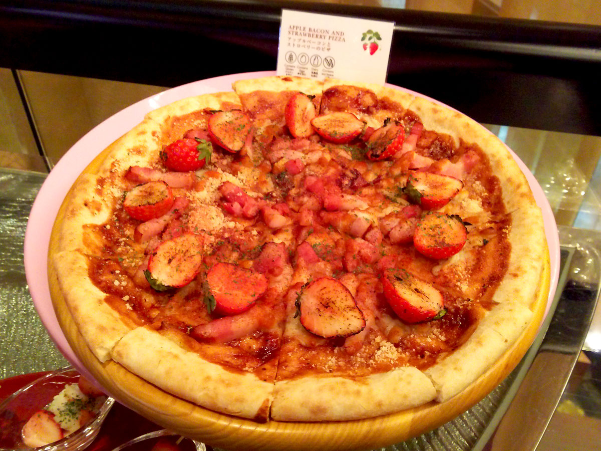 そんな軽食メニューも、今回はいちごづくし!注目なのが、「アップルベーコンとストロベリーのピザ」。え?いちごのピザ!?と思いますが、いちごとベーコン、甘さとしょっぱさの絶妙なバランスがたまらない必食メニューです。