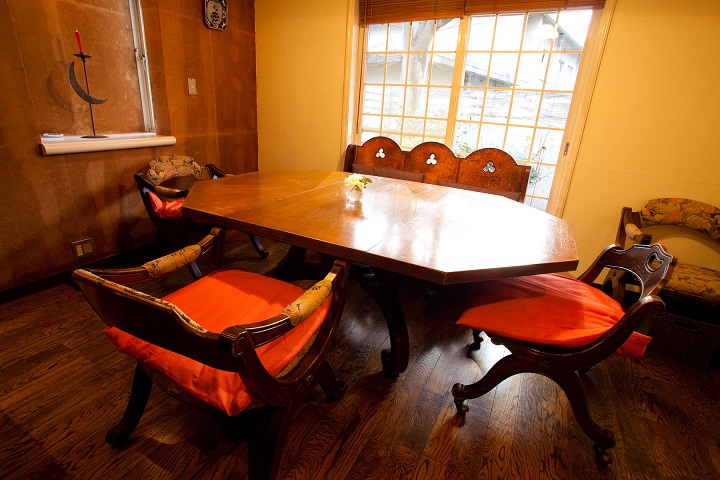 一輪の季節のお花が飾られた重厚なアンティークのテーブルで、お寿司をいただく優雅な朝。