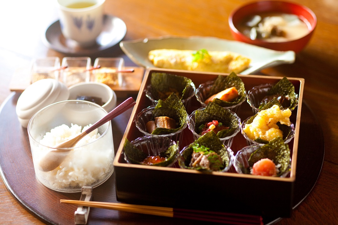 もうひとつの「花梓侘」のモーニングは、塗りの重箱に眞田紐をかけて供される「朝の玉手箱」。
