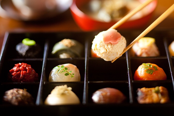 ふたを開けると、9種類のおにぎりが楽しめるセットが。天ぷらやいくら、みそ漬けの鮭など、「つまみ寿司」とは違うネタや、焼き穴子などが入っています。