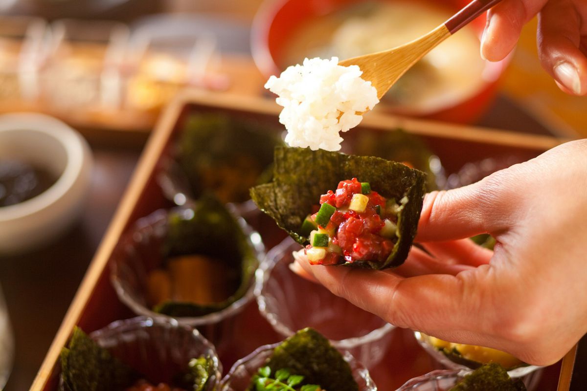 小鉢からのりごと取り出し、お好みの分量のごはんを入れて軽く握りながら食べます。お代わりもできるので、たっぷりごはんを使っても大丈夫。